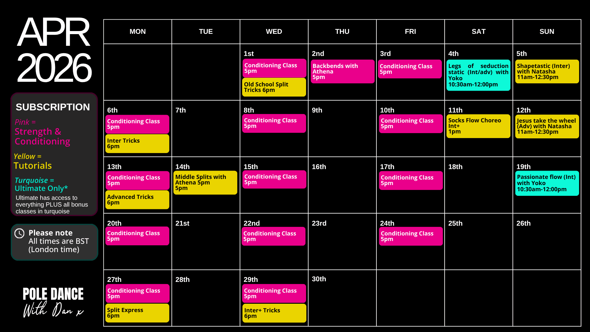 From conditioning workouts to tricks and choreography – there’s something for everyone! Whether you’re a beginner or an advanced poler, Dan’s classes are scaleable for all levels and focus on broadening your pole knowledge, while improving your strength and stamina to feel amazing and confident.